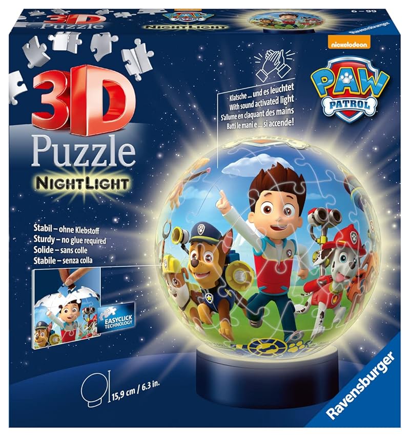 Ravensburger 3D Puzzle 11842 - Nachtlicht Puzzle-Ball Paw Patrol - 72 Teile - ab 6 Jahren, LED Nachttischlampe mit Klatsch-Mechanismus